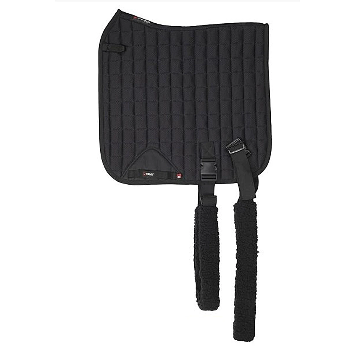 Combines all the benefits of the popular FIR-TECH saddle pad with elastics to help strengthen the back and abdominal muscles of your horse. Training with this saddle pad can result in improved movement and balance. The saddle pad has Synthermax fiber fill and inner material with woven ceramic particles, providing an advanced double-acting effect. The result is that the flexibility of the back muscles increases. Elastics are fastened with large snap buckles to the saddle pad and can be adjusted lengthwise as needed. A soft plush lining around the elastics ensures that the horse is not worn by the elastics during work. Should be used with caution.