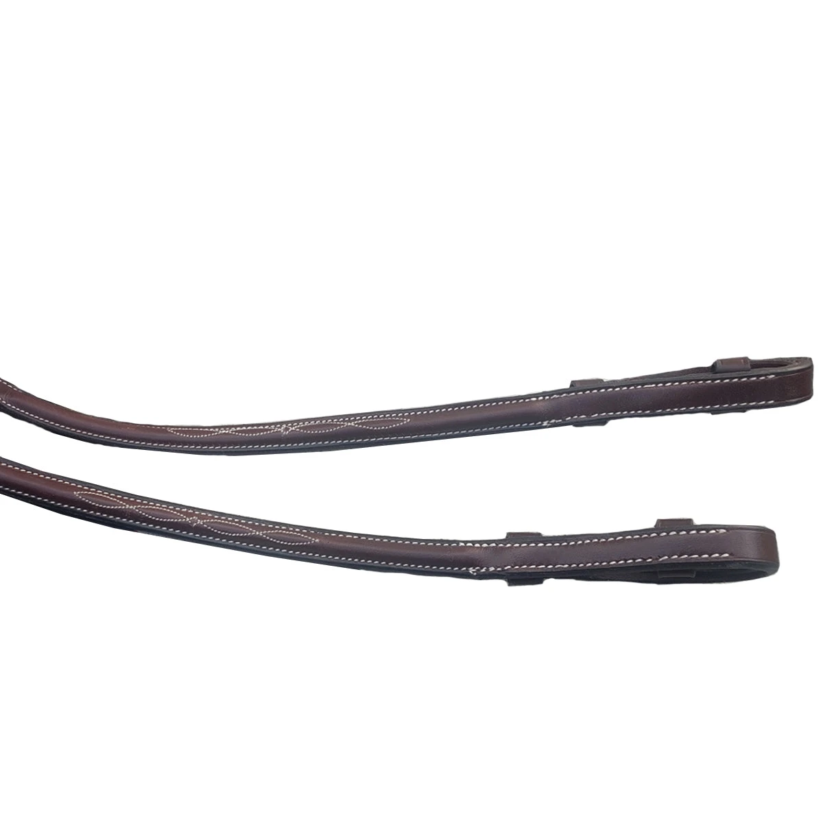 We love this Equiline Pony Bridle because it offers soft padding, beautiful fancy white stitching and comes with reins!