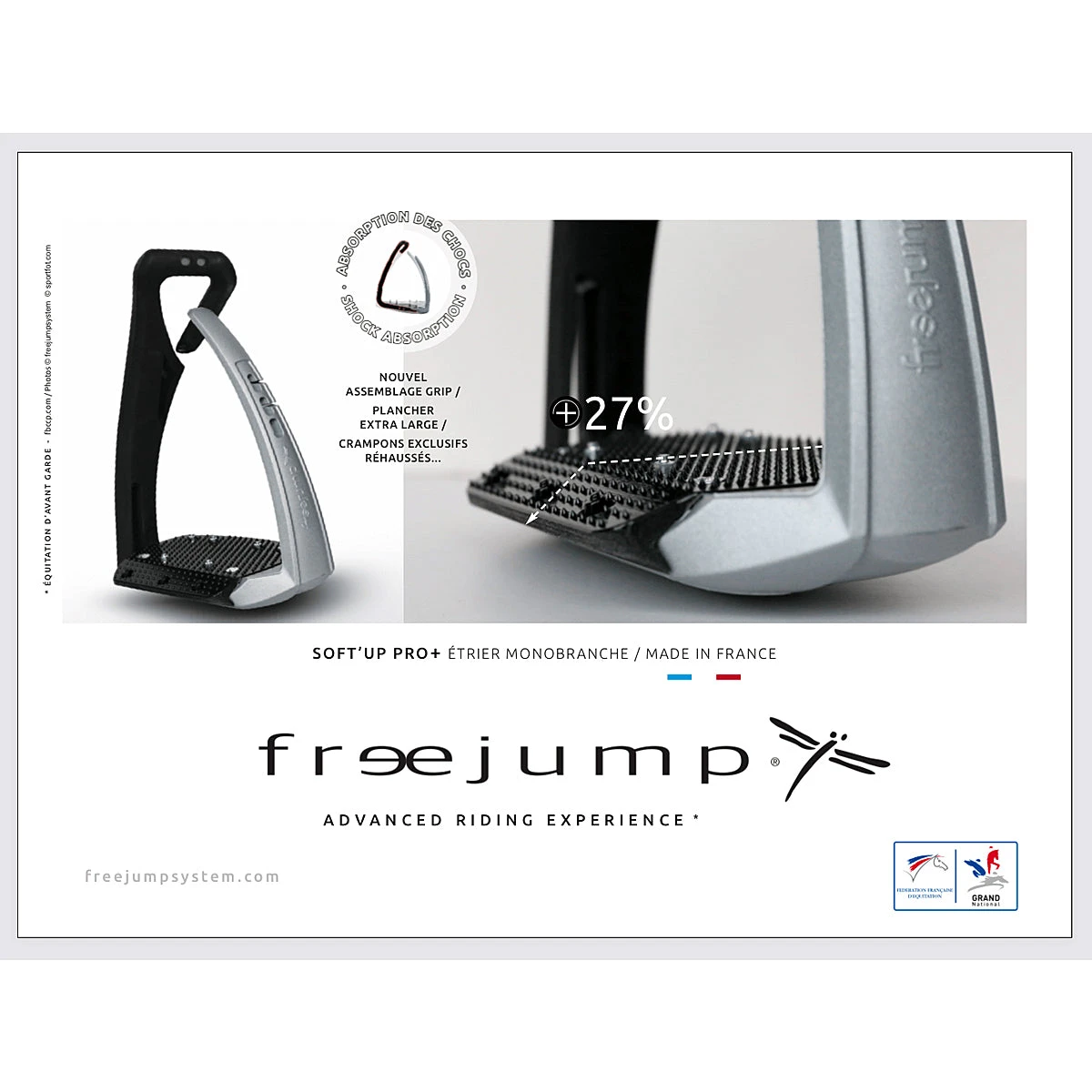 SOFT’UP PRO, praised amongst the World’s Top Riders, is a single branch stirrup that combines performance, comfort, safety, and simplicity. Its patented flexible outer branch made of Elastollan® helps to free the foot in case of a fall. The nonskid wide elastomer floor, the ABS shell, and the high resistance spring steel mono branch guarantee a better riding experience.