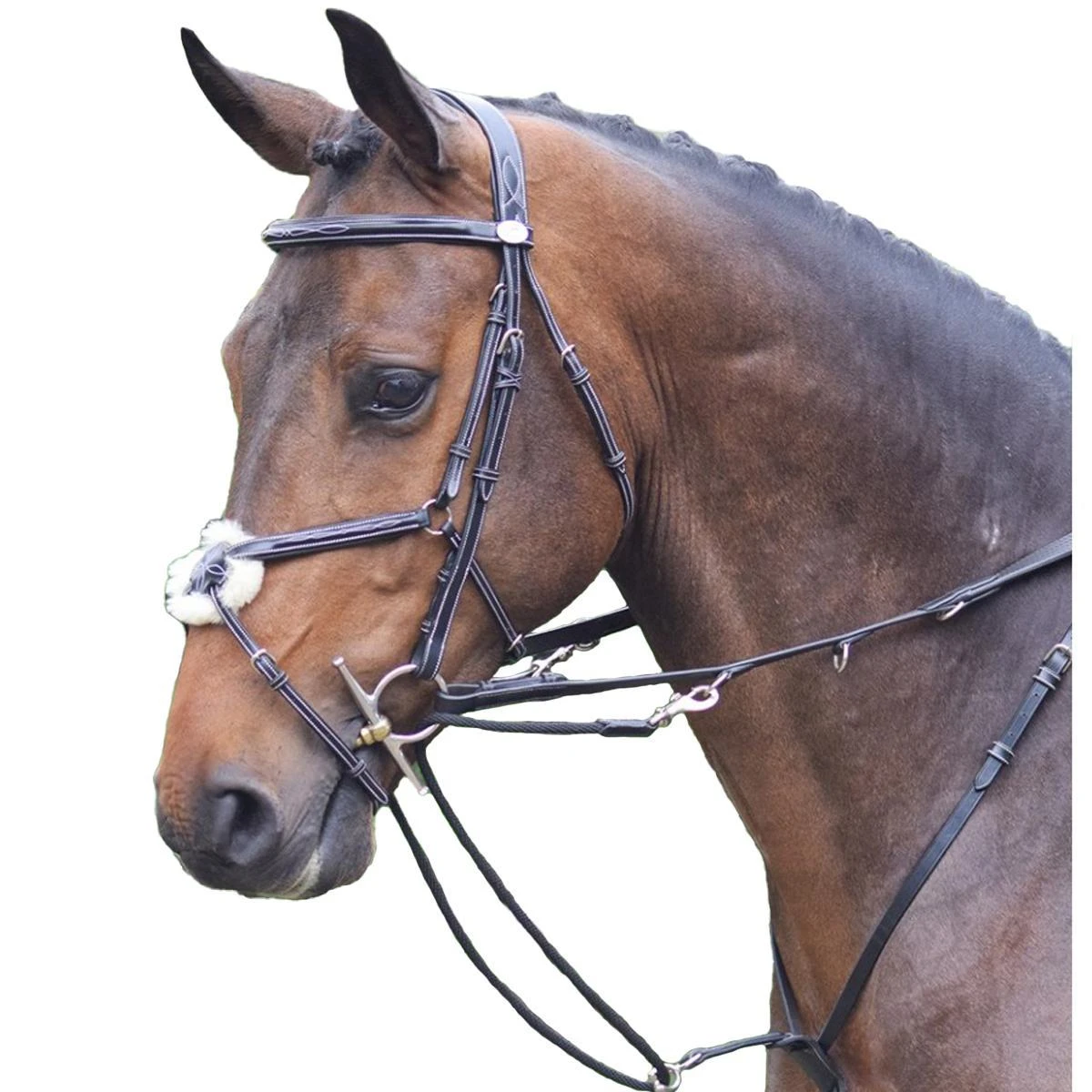 The Howlett is unique in that it includes a central pulley that allows freedom of side to side movement as opposed to a traditional German martingale. There are three levels of adjustment depending on which rein ring is used.