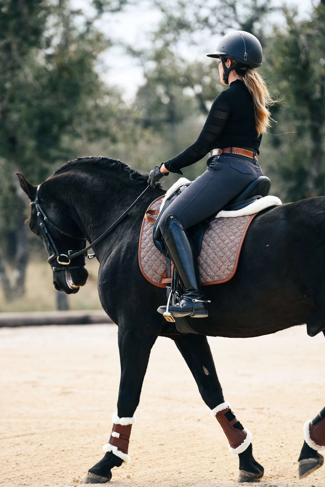 We love this statement Sixteen Cypress Dressage Pad, crafted in our signature herringbone tweed with elegant cognac leatherette trim. Designed for high performance, it features contoured wither relief, breathable 100% cotton outer fabric, and a soft, moisture-wicking sport mesh lining to keep your horse comfortable. The durable leather alternative finish supports the pad’s shape, while adjustable girth straps ensure a perfect fit. This pad beautifully complements horse, rider, and tack, making it an essential addition to your dressage gear.