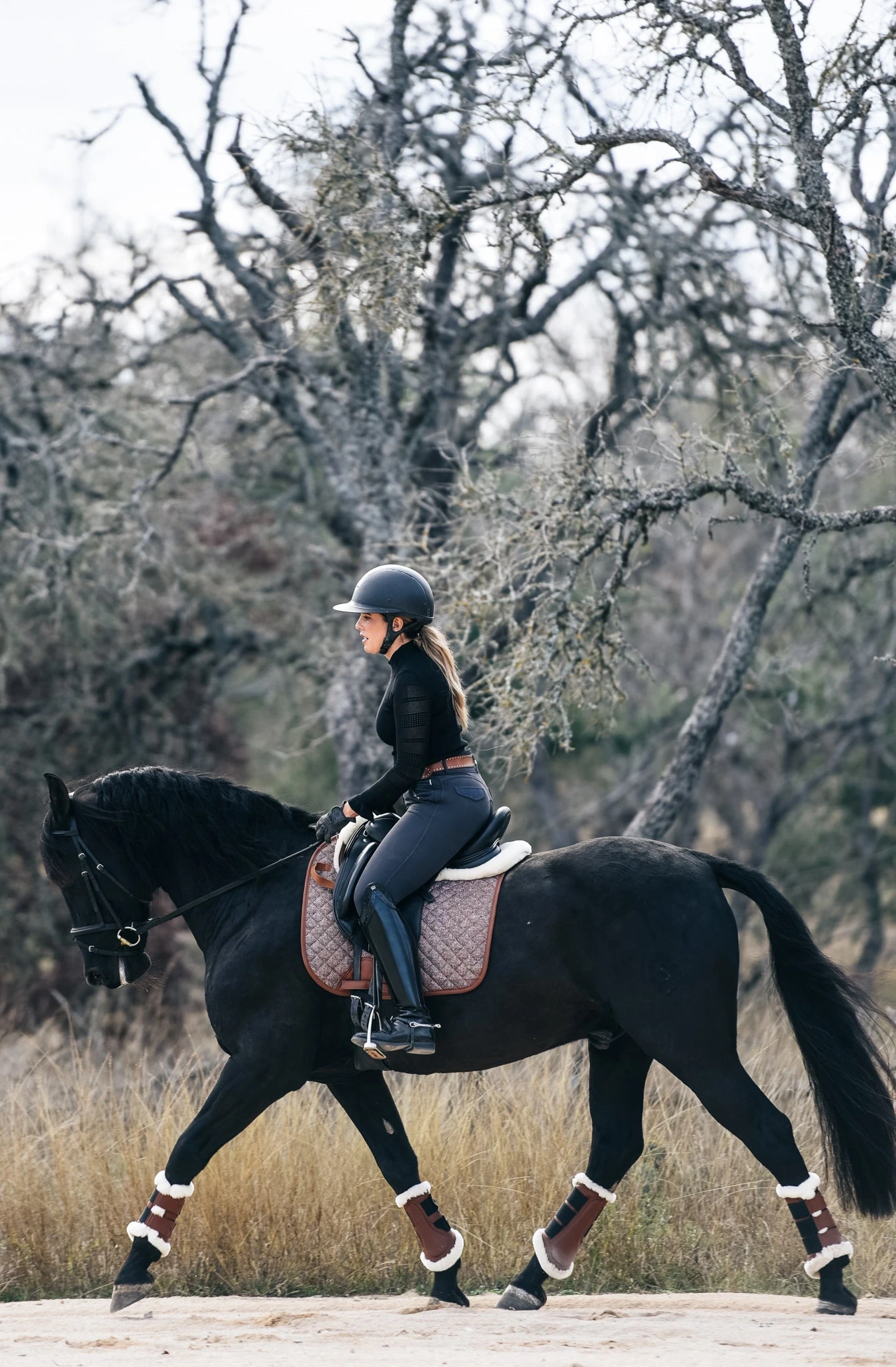 16 Brushing boots in hickory brown leatherette with ivory faux sheepskin lining.